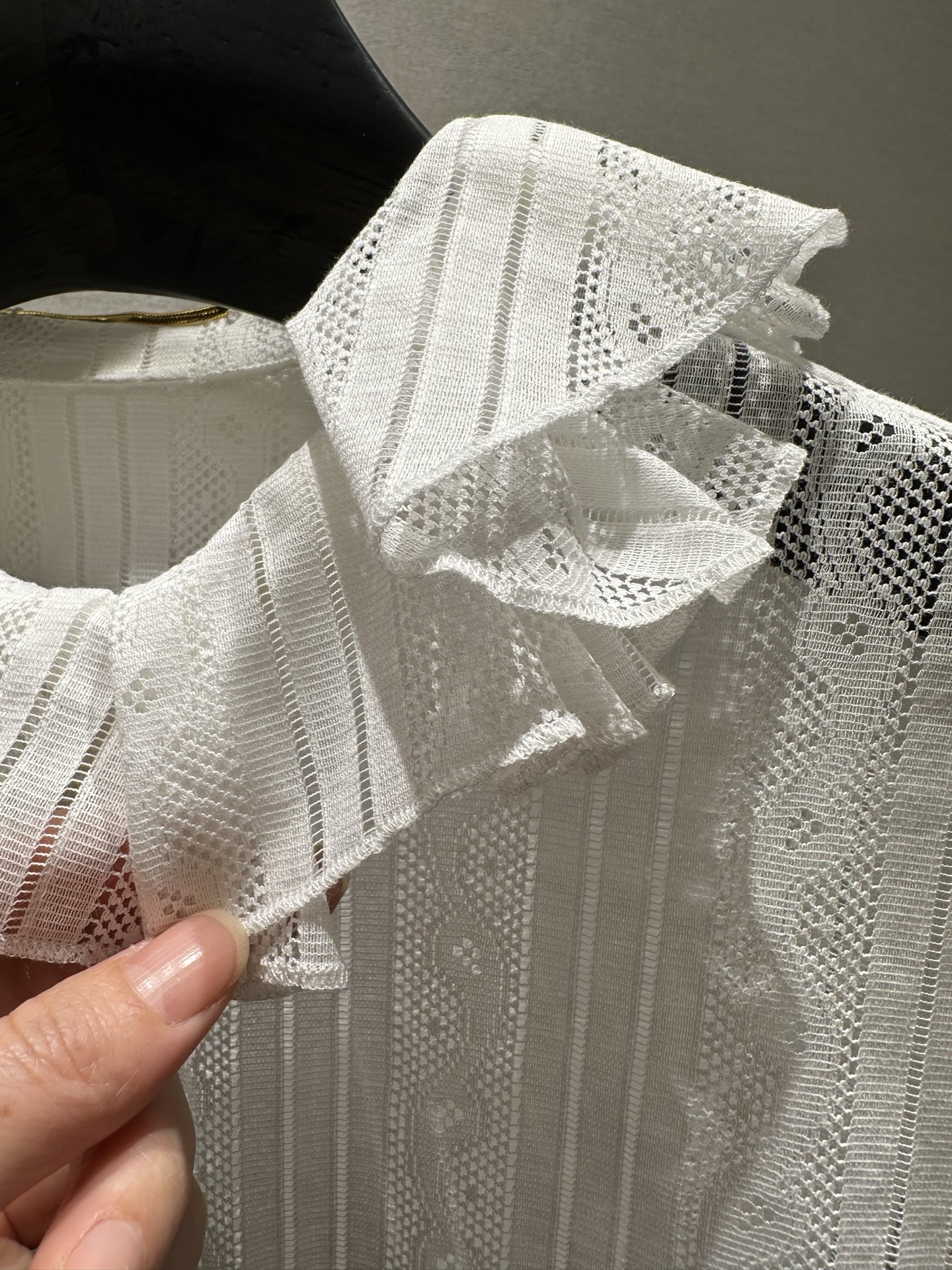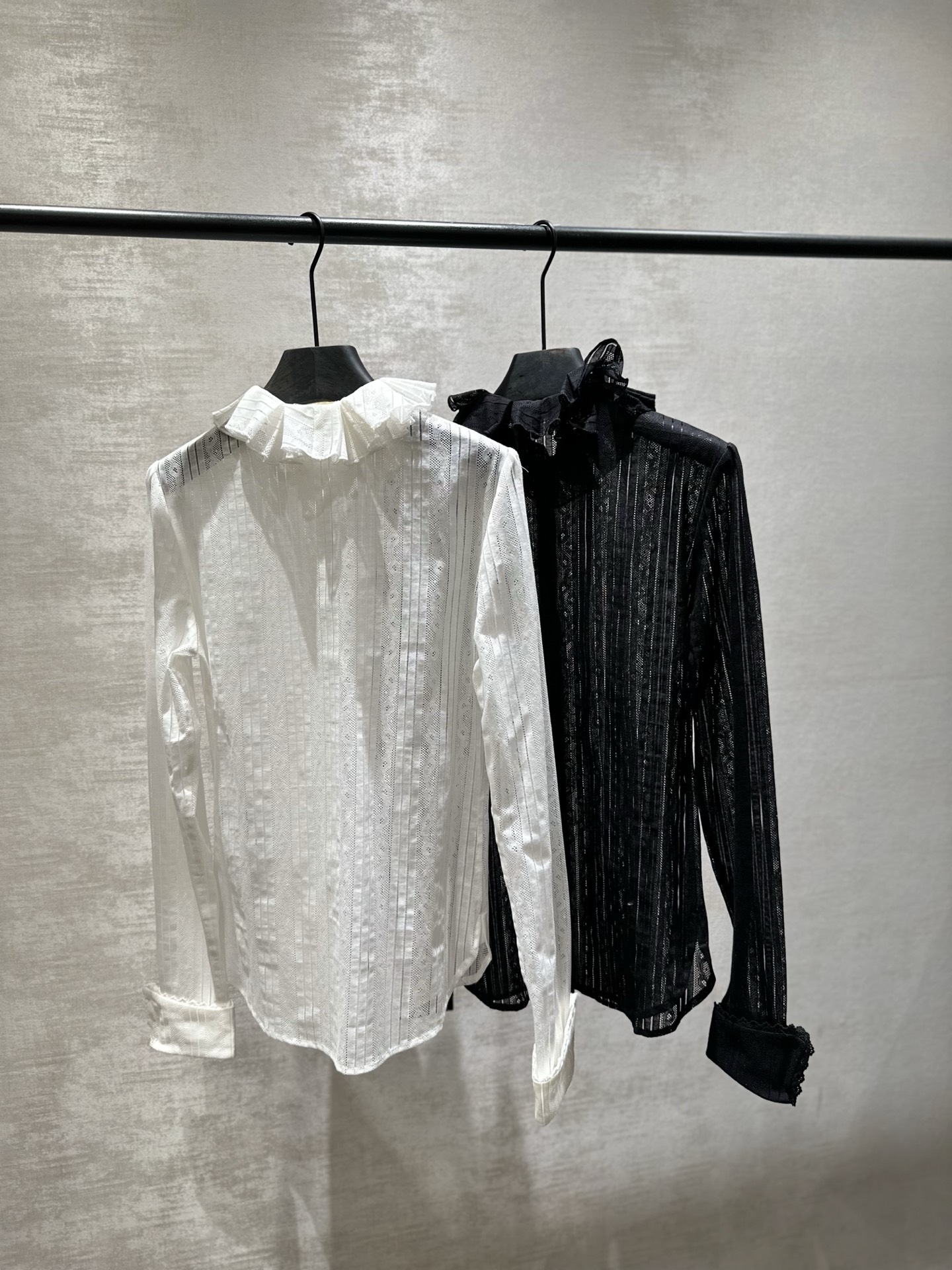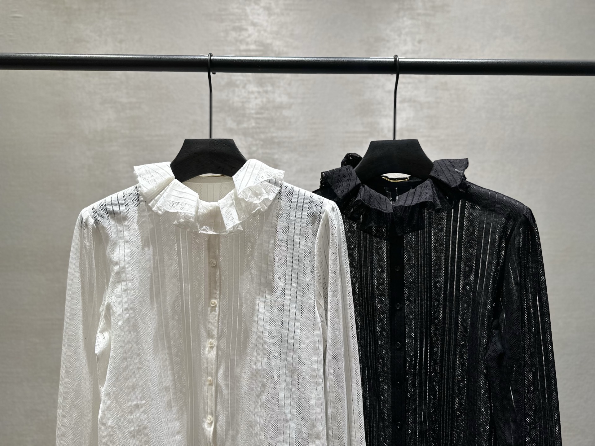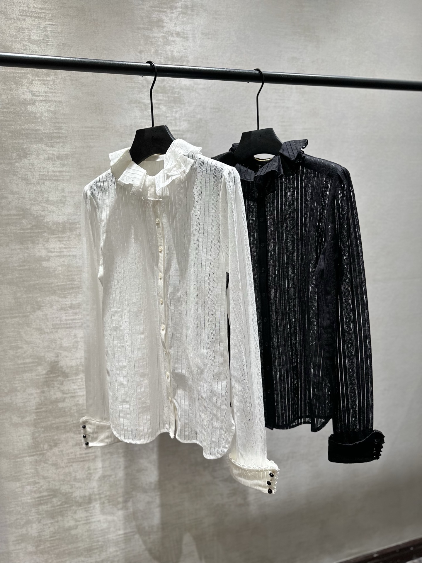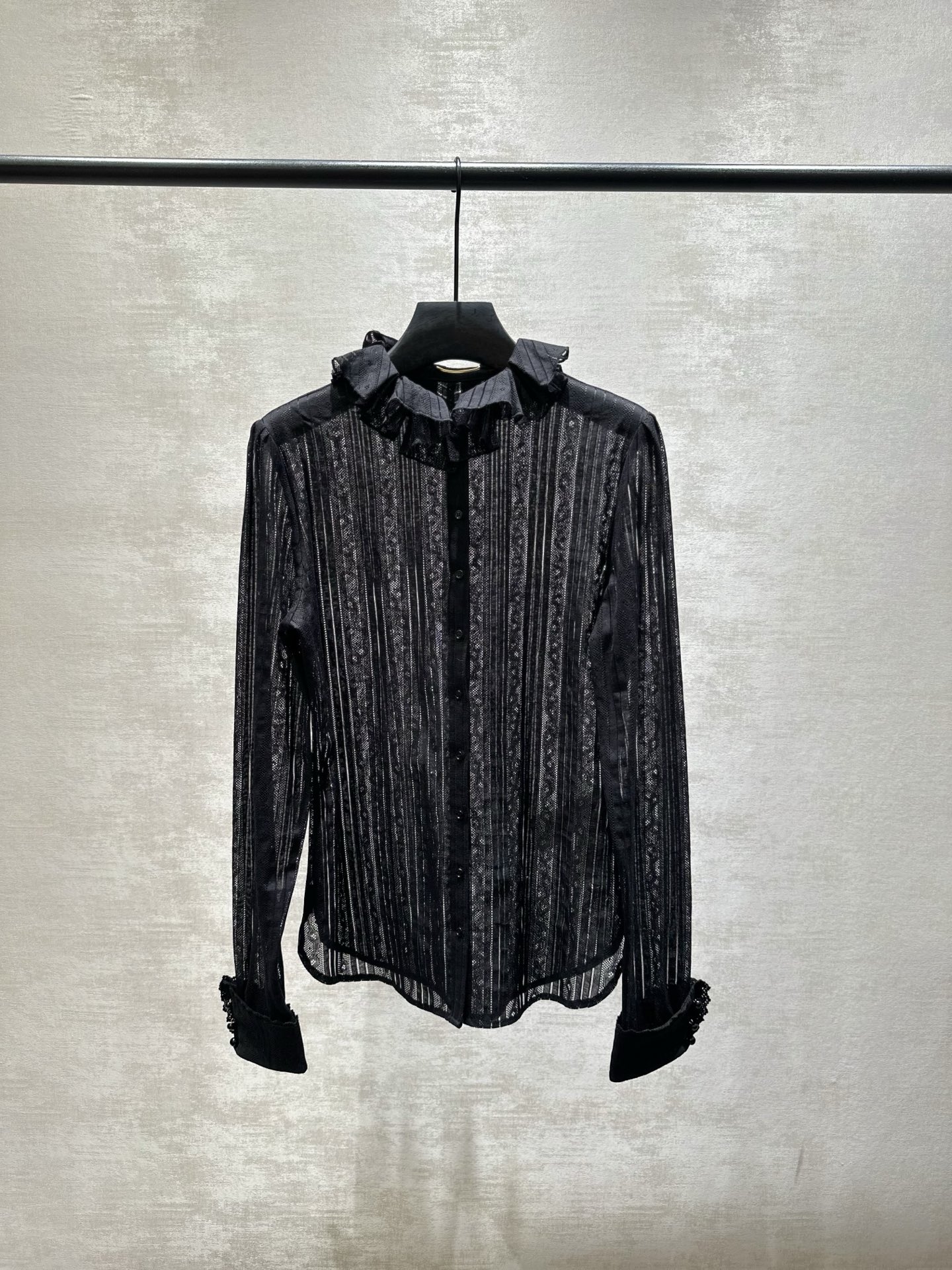 Saint Laurent heavy-duty embroidered lace blouse with slightly hollowed-out neckline and ruffled trim design. Youthful and girly style. Made of silk-cotton fabric. Available in White and Black. Sizes 38, 40, 42, 44, 46 (S, M, L, XL).