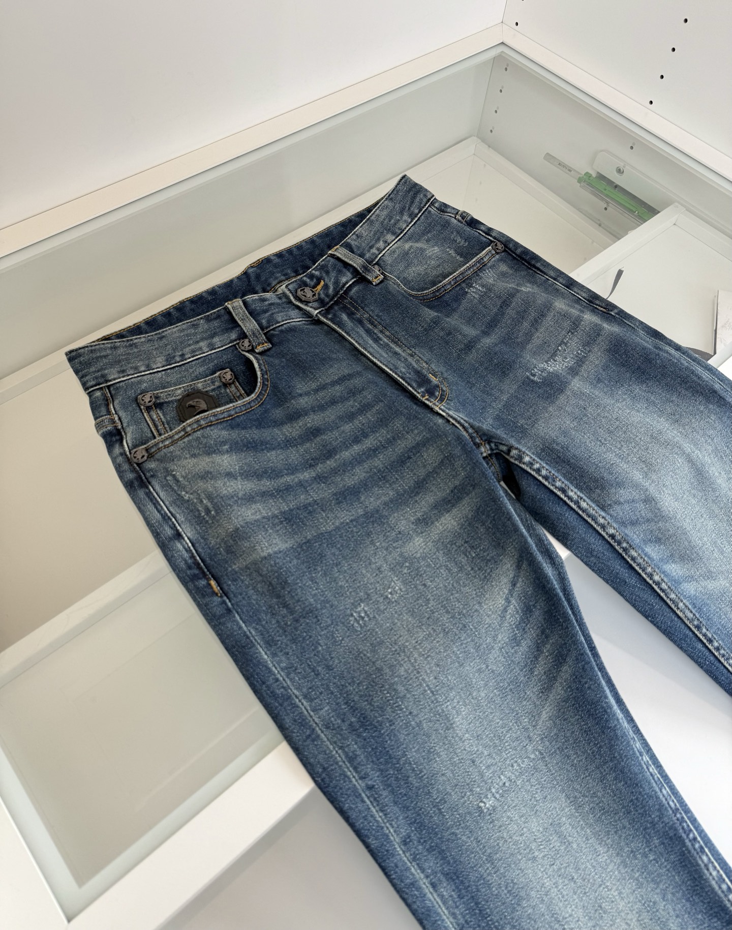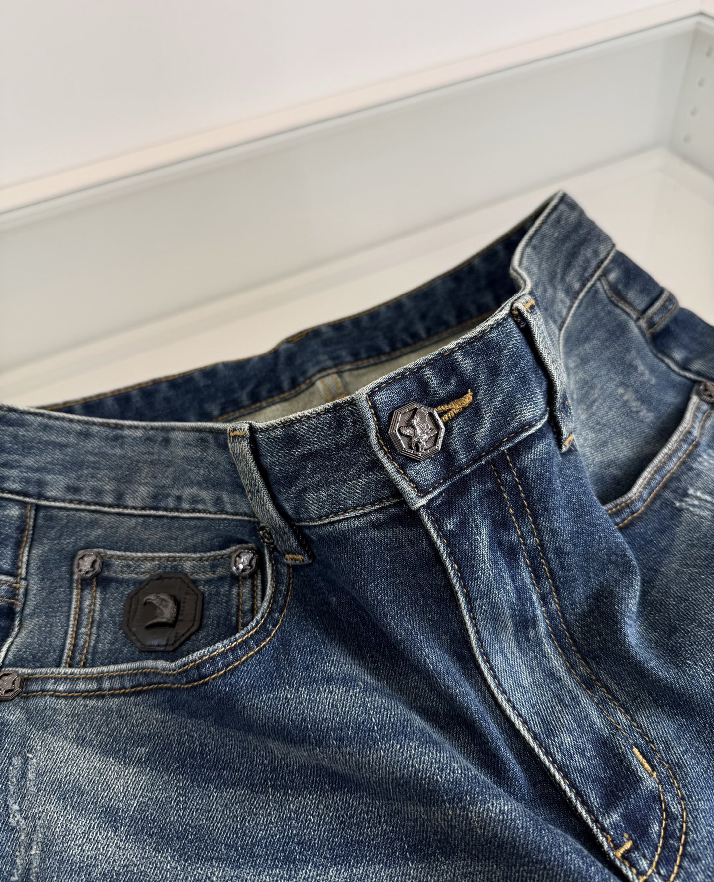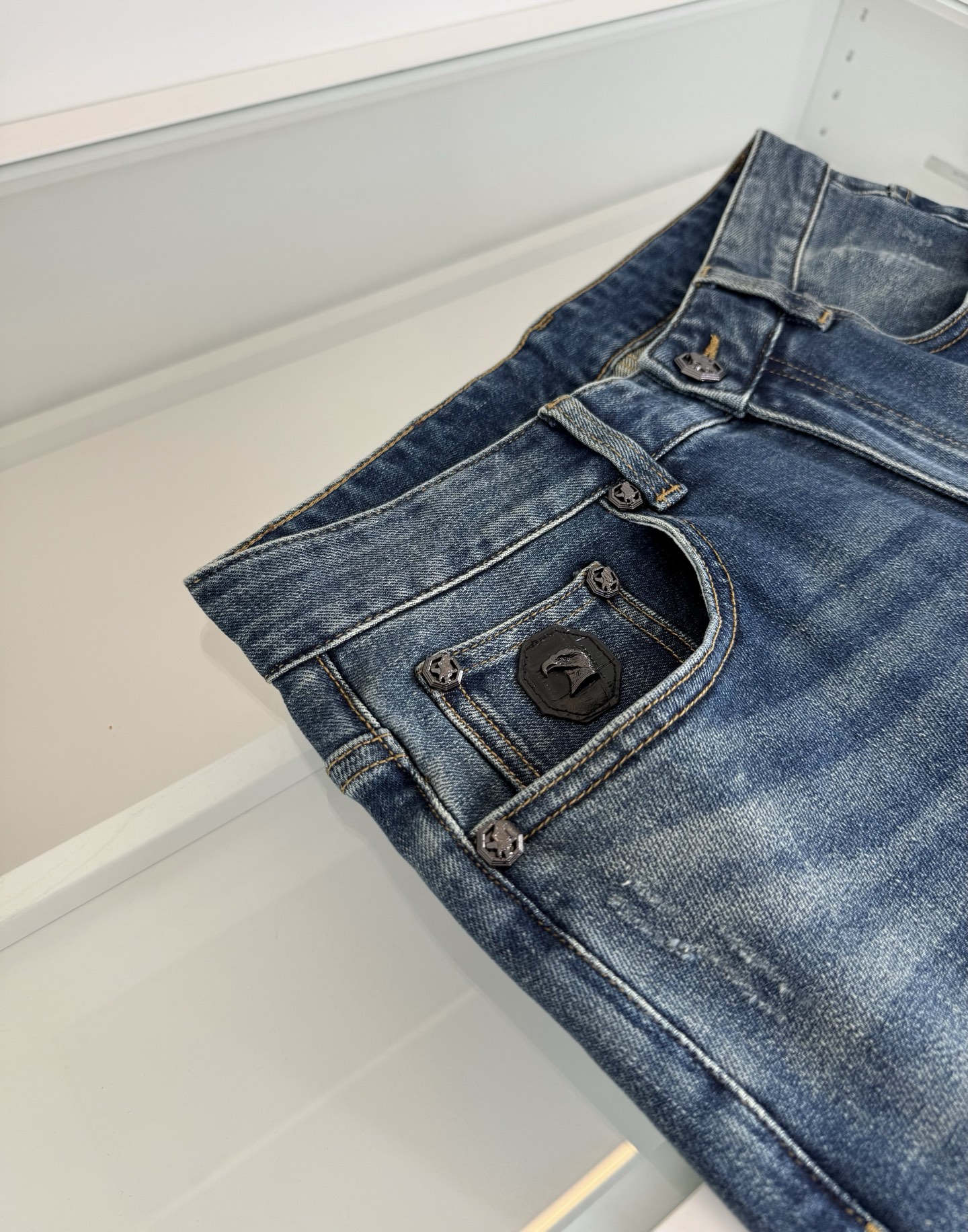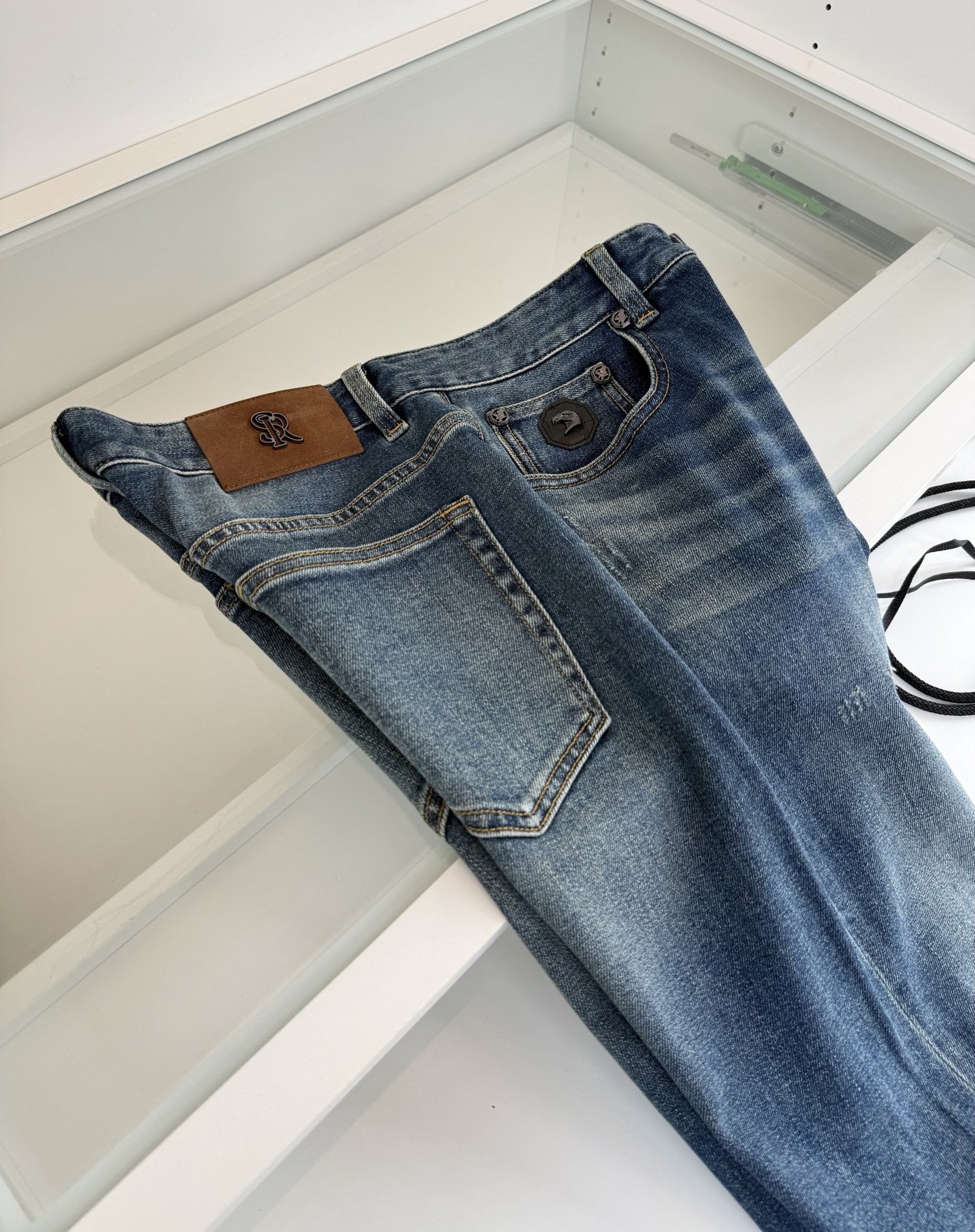 Stefano Ricci 2026 Spring/Summer retro fashion classic five-pocket slim straight jeans. Classic five-pocket design with eagle head detail on small pocket. Metal leather patch, premium hardware with classic eagle logo. Natural eco-friendly wash, perfect color matching. Retro trendy look, fitted style. Imported denim fabric, spring/summer weight with stretch, comfortable and stylish. Sizes: 30-38.