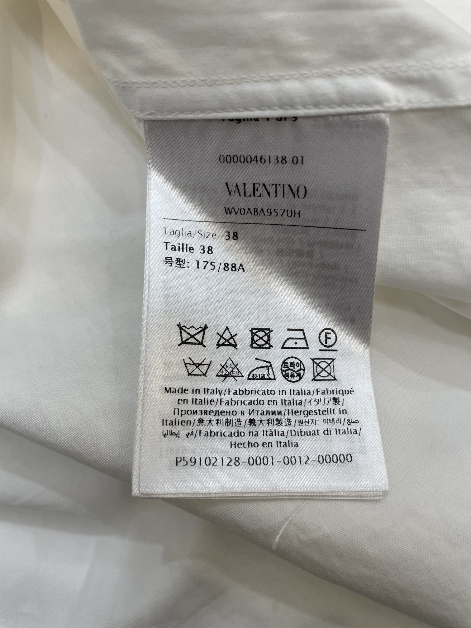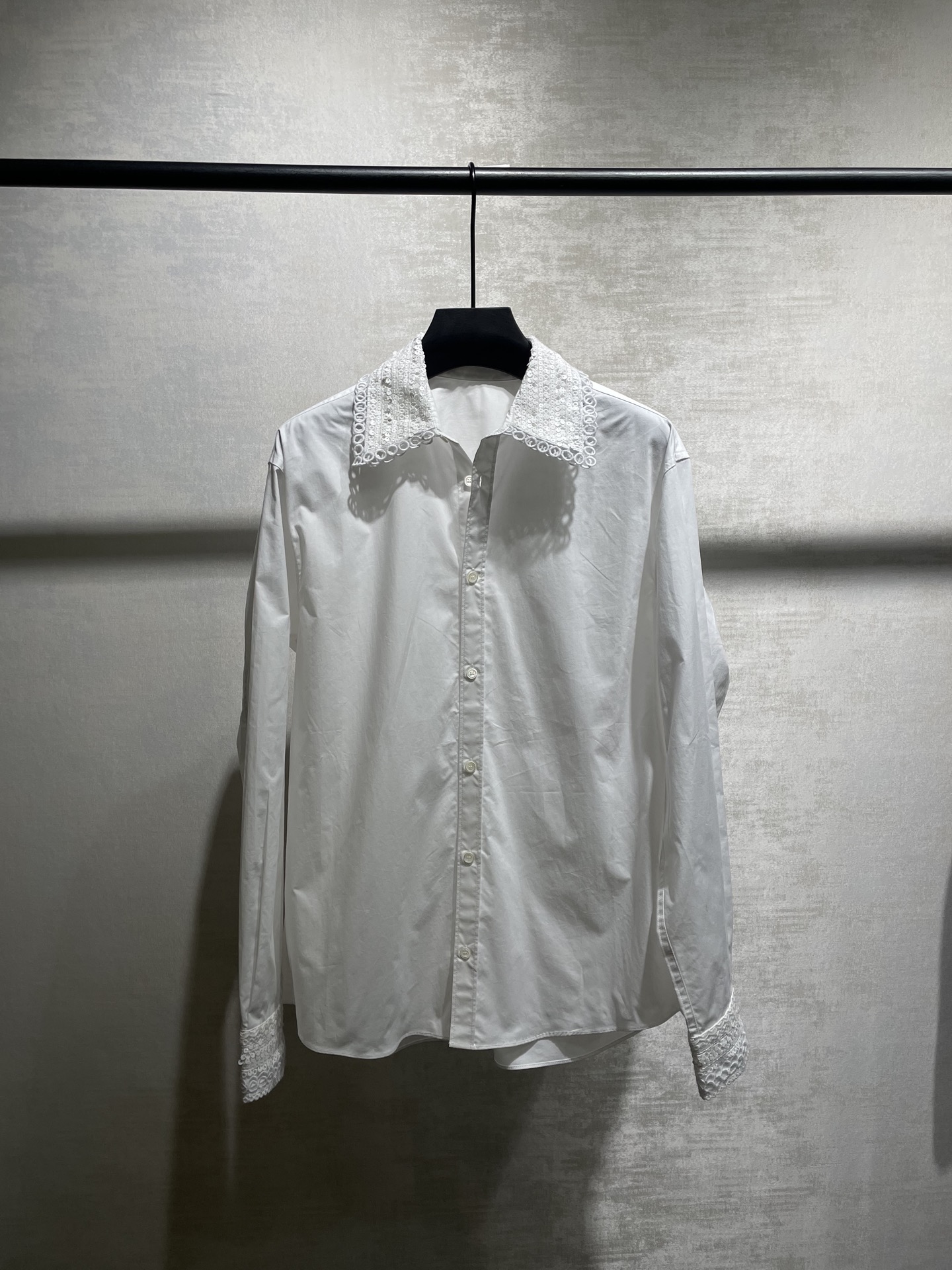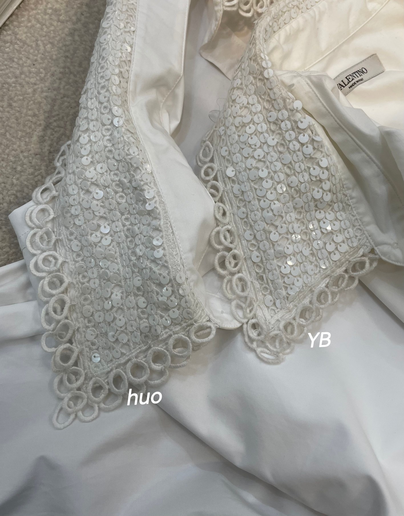 Valentino white shirt made from 100% imported long-staple cotton, 200-count high-density fabric. Features intricate embroidery and sequin details on collar and cuffs. Complex craftsmanship, loose fit. Sizes 34, 36, 38 (XS, S, M).