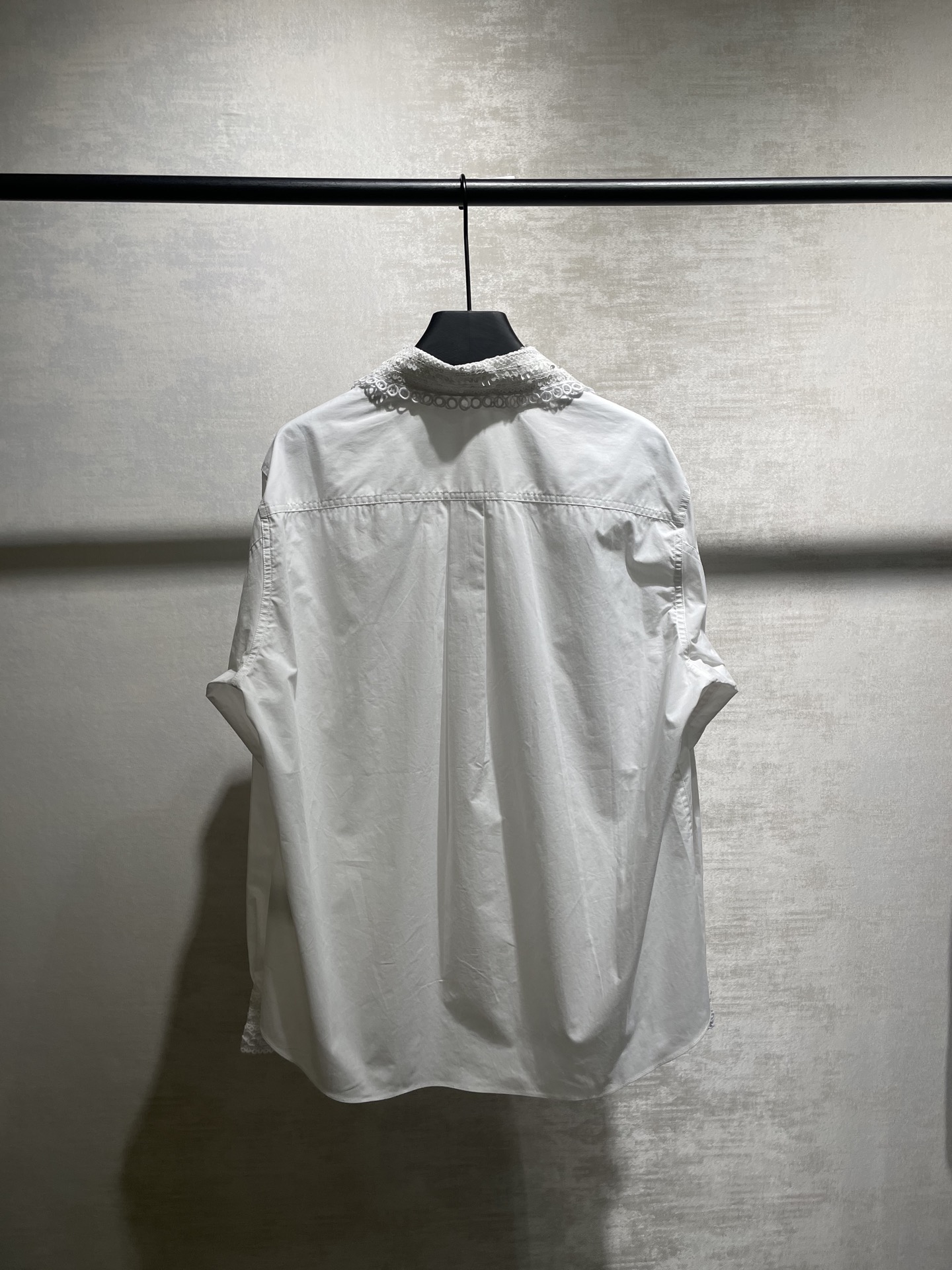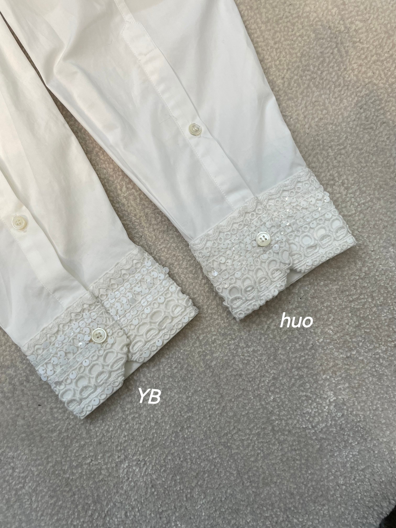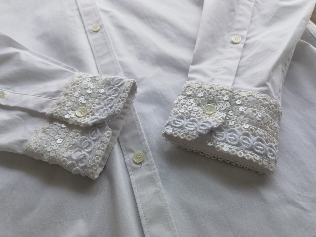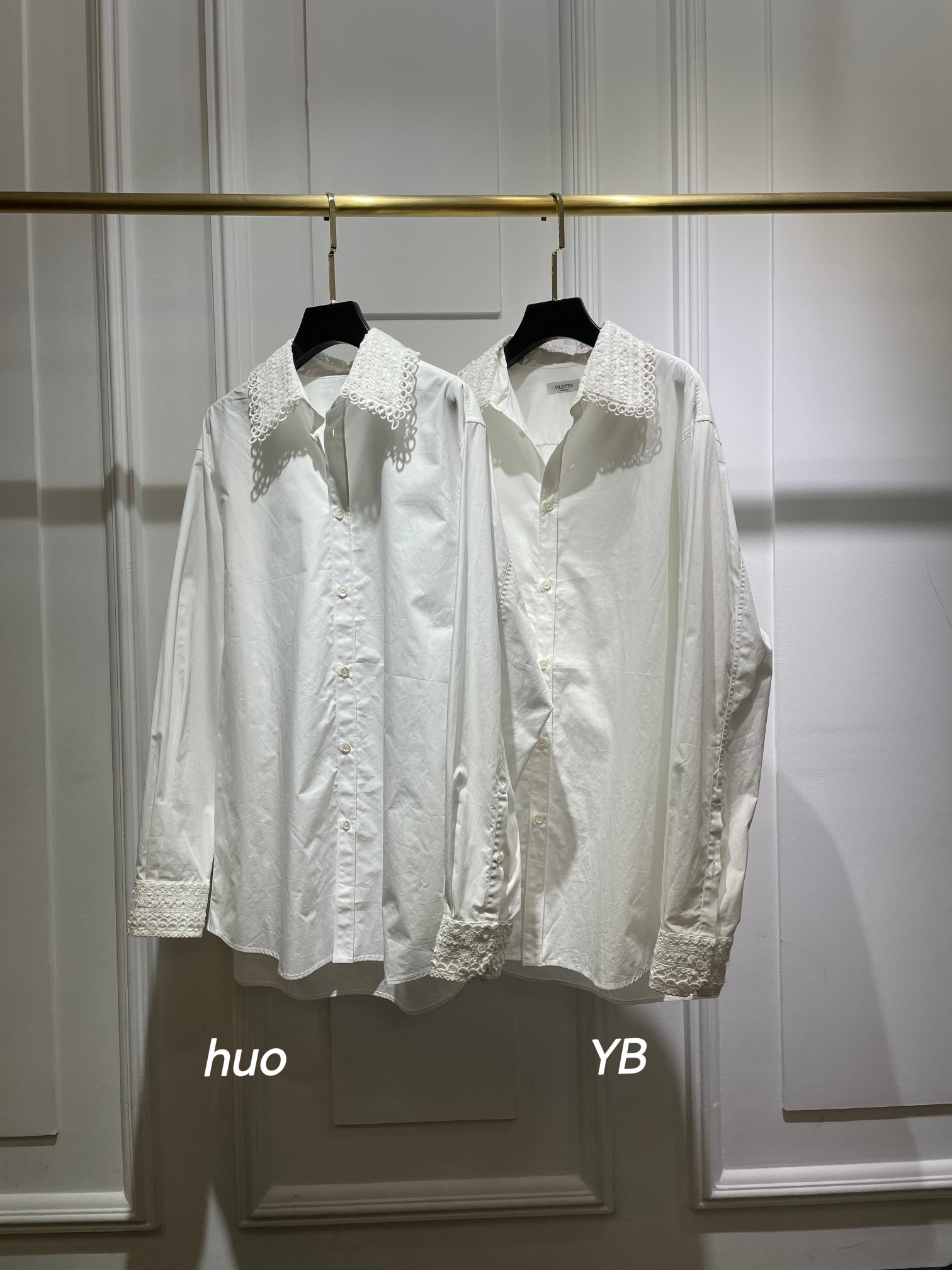 Valentino white shirt made from 100% imported long-staple cotton, 200-count high-density fabric. Features intricate embroidery and sequin details on collar and cuffs. Complex craftsmanship, loose fit. Sizes 34, 36, 38 (XS, S, M).