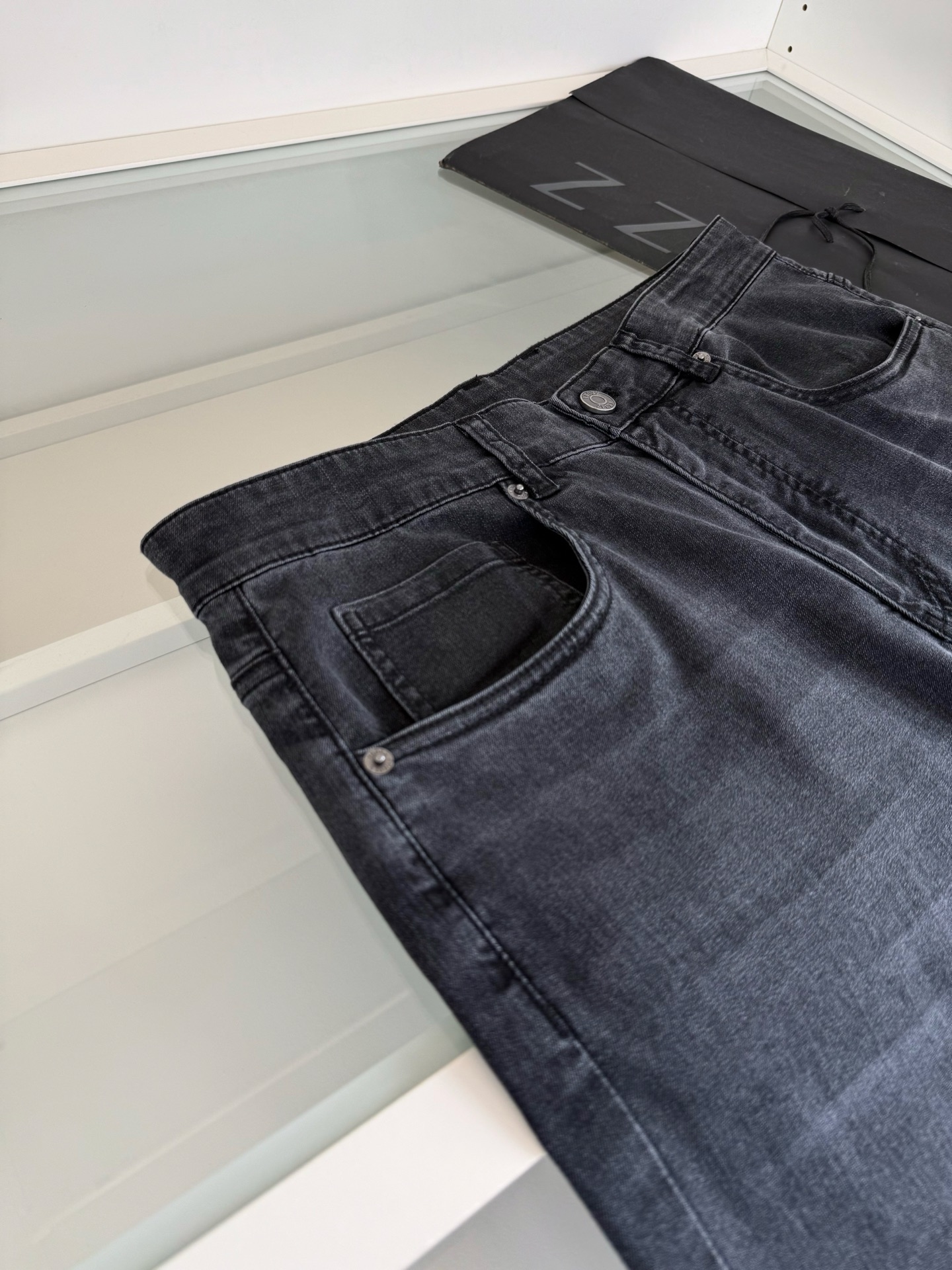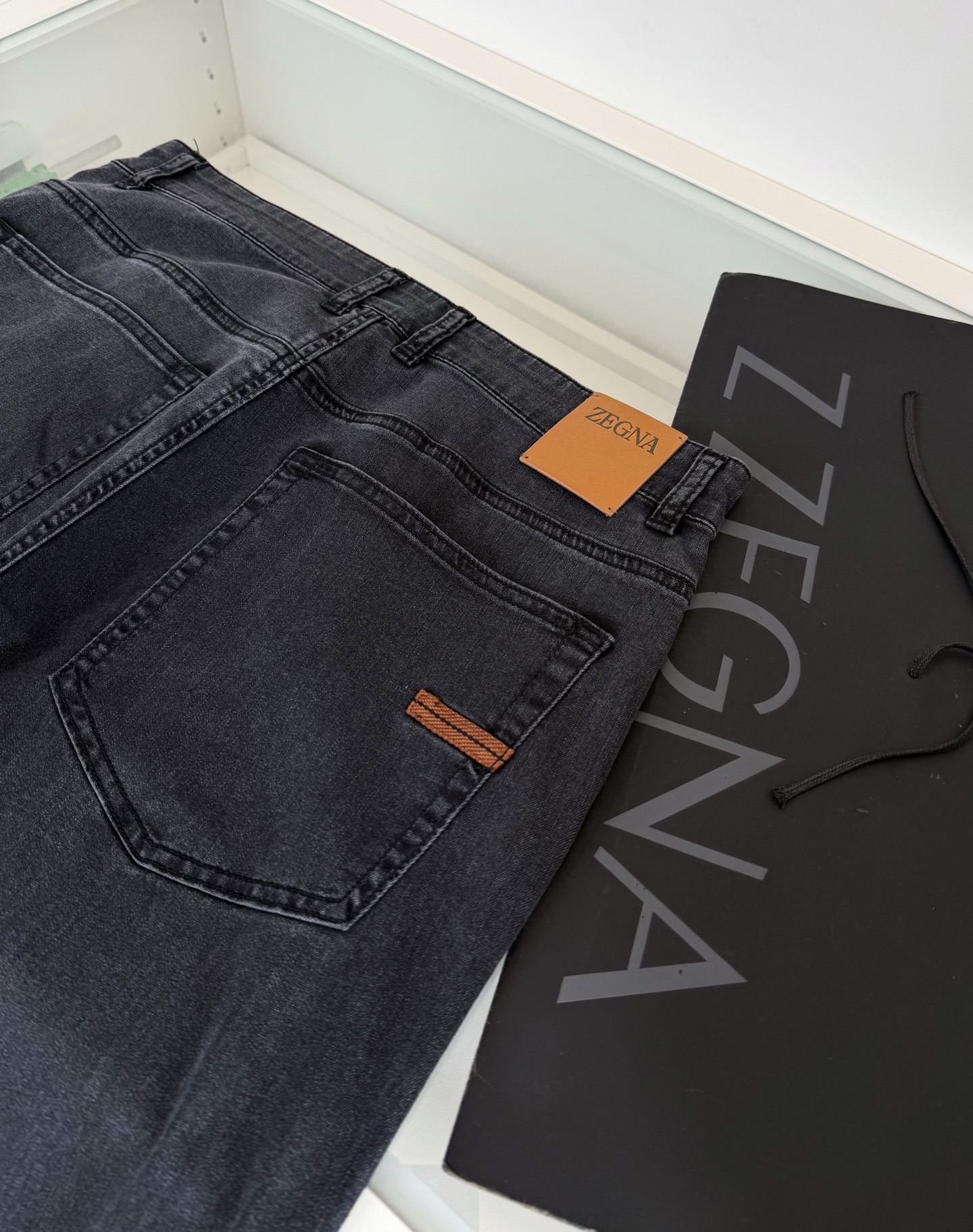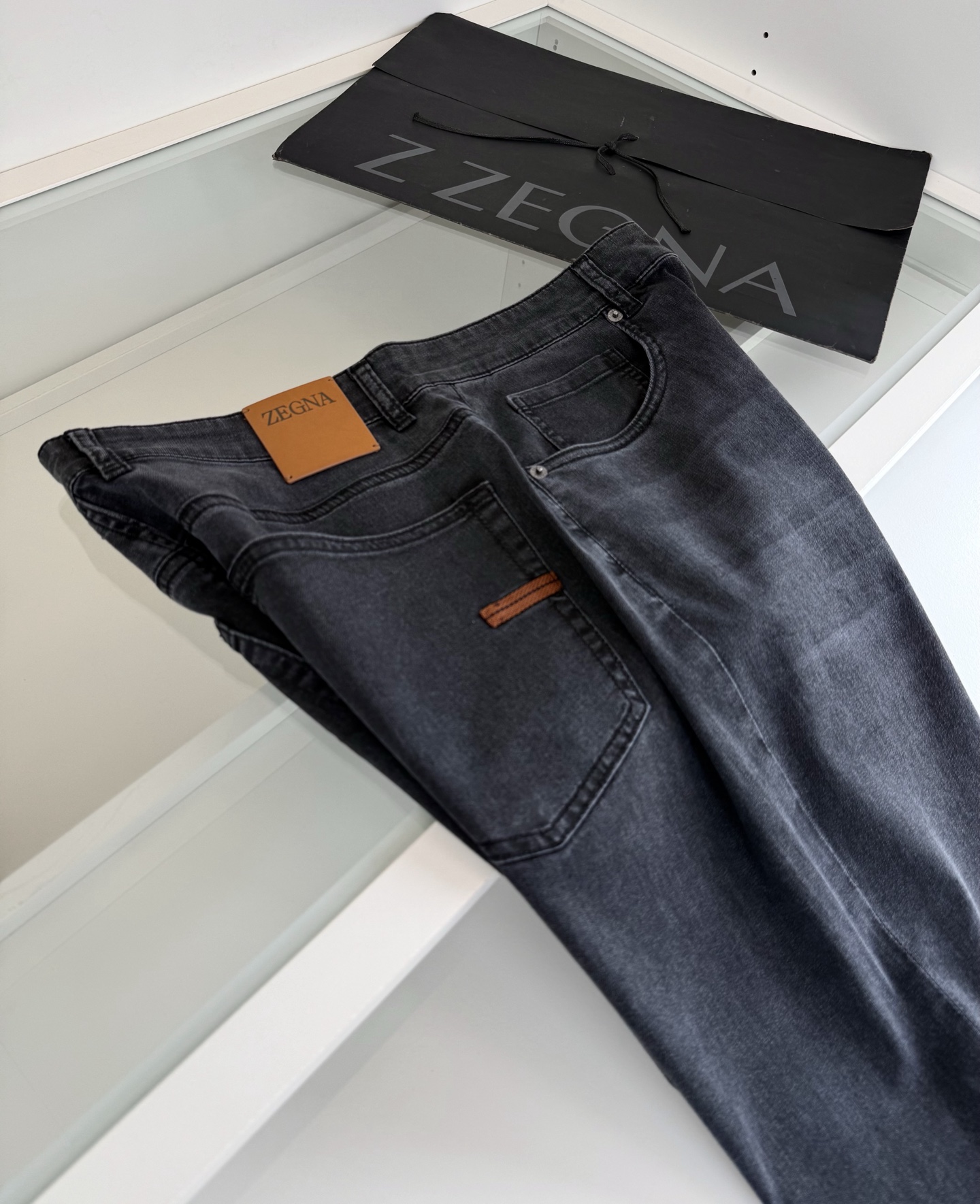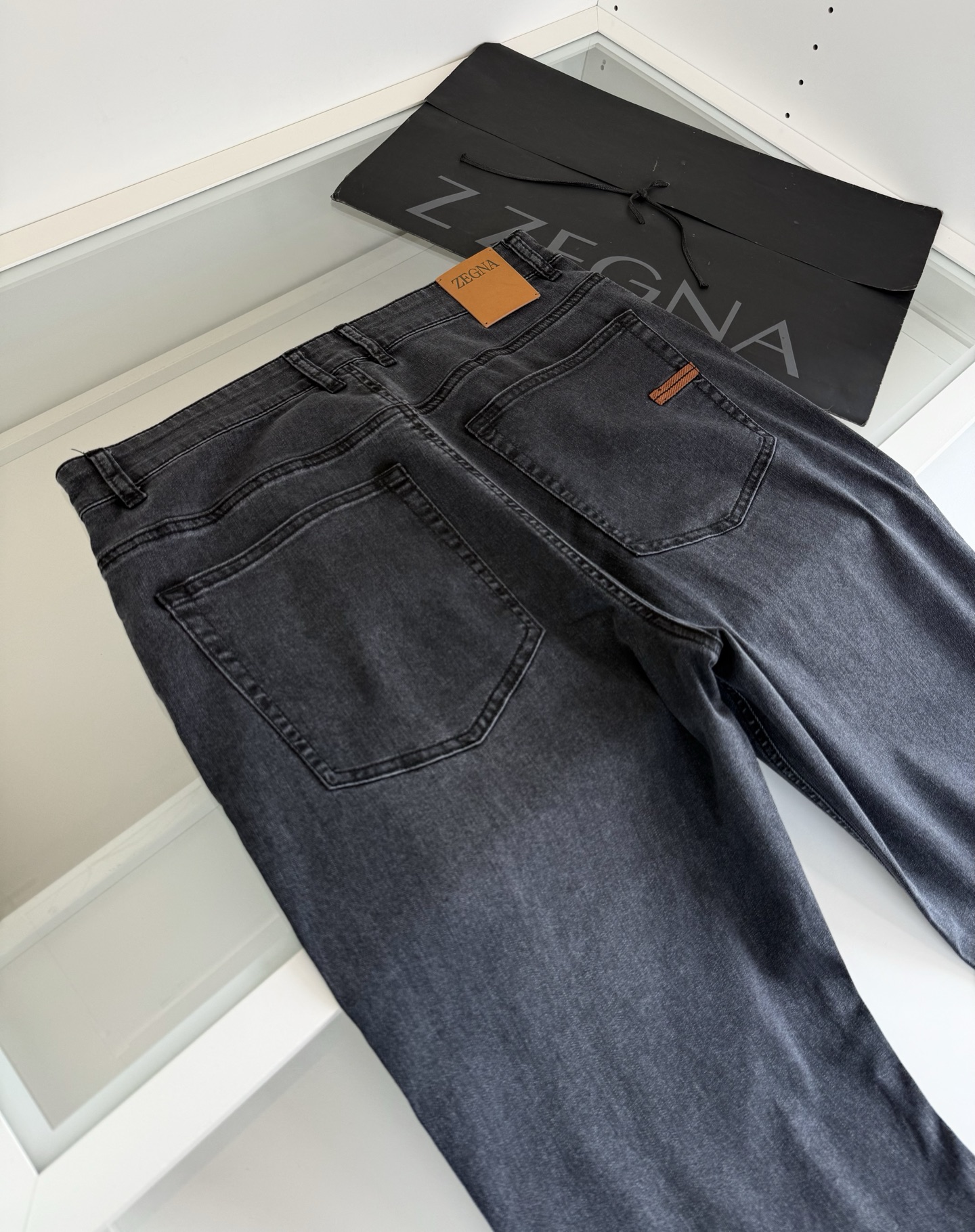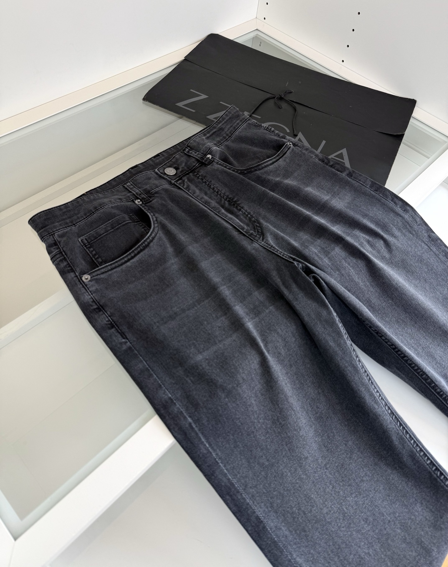 Zegna 2026 Spring Summer classic five-pocket grey wash men’s jeans. Every year classic款式, must-have for men’s wardrobe. Premium hardware details,严格按照图纸完成. Fitted cut, not tight, no restriction, but slim and tall. Natural eco-friendly grey wash, perfect color matching, versatile. Custom ordered summer lightweight denim fabric with good sheen and slight stretch, comfortable and breathable with structured look. Sizes: 30-38.